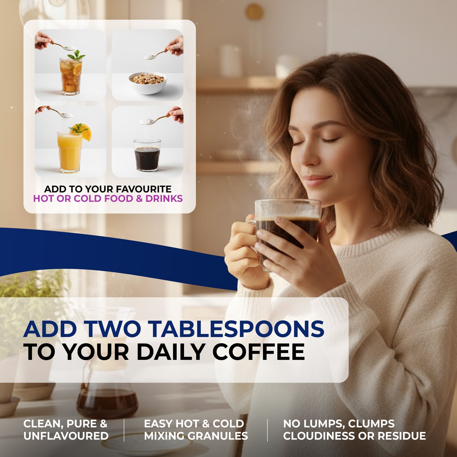 - Maximum Flexibility: Easily mix it into coffee, water, smoothies, tea, milk, soup, and countless other recipes.