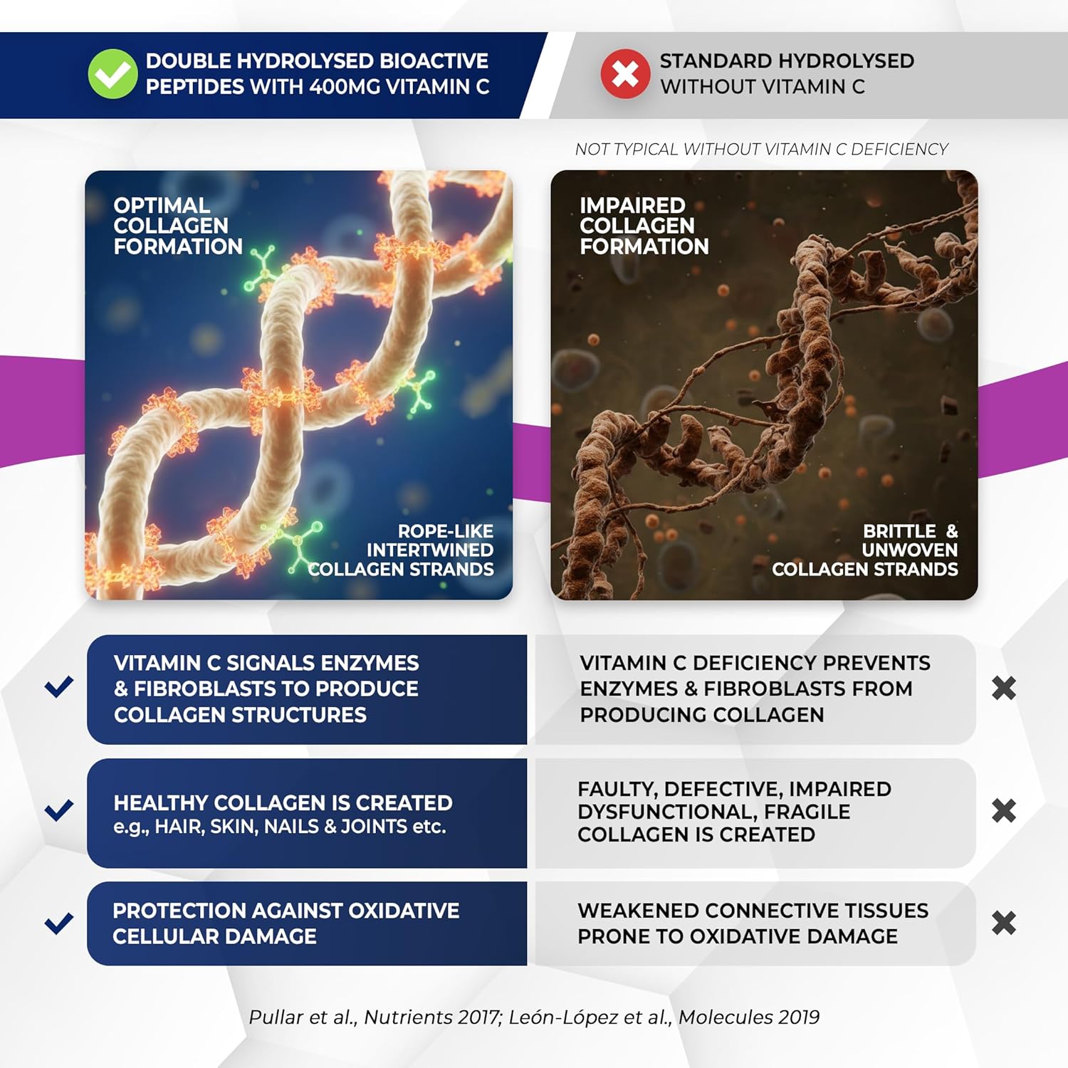 León-López, A. et al. (2019).Collagen Hydrolysates for Skin Health: A Review. Molecules, 24(18), 3078.Shaw, G. et al. (2017).Vitamin C-enriched gelatin supplementation before intermittent activity augments collagen synthesis.Am. J. Clin. Nutr., 105(1), 136–143.